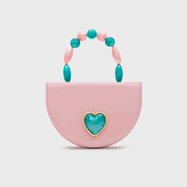 Cartera pequeña en cuero rosa suave, de forma redondeada y estructura firme. El frente está decorado con un corazón central en tono verde agua con borde dorado, que contrasta y resalta sobre el cuero. Cuenta con asa corta de cuentas combinadas en rosa y turquesa, aportando un aire fresco y veraniego. Un accesorio femenino, delicado y perfecto para darle color a cualquier outfit.