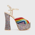 En nuestro planeta Sunshine descubre nuestro Retro Sunshine Plataforma que destaca por los colores icónicos usados en terciopelo y su suela de cuero. Esta Plataforma mide 5 cm y tiene un taco de 14 cm perfecto para darle ese toque brillante a tu outfit. En la parte del tobillo tiene una correa para ajustarlo a tu preferencia.