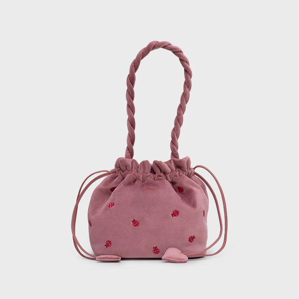 Cartera tipo bucket en color rosa. Su forma cilíndrica y amplia permite llevar todo lo esencial con comodidad. El frente lleva pequeñas mariquitas bordadas y el cierre superior se ajusta con cordón. Un accesorio práctico y lleno de energía positiva.