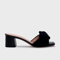 Zapato midi en cuero y terciopelo negro con diseño clásico de punta abierta. El frente lleva un moño en terciopelo que añade un contraste elegante. Plantilla y forro en cuero para confort, suela de cuero resistente y taco midi de 5 cm. Atemporal y versátil, con un detalle que lo hace único.