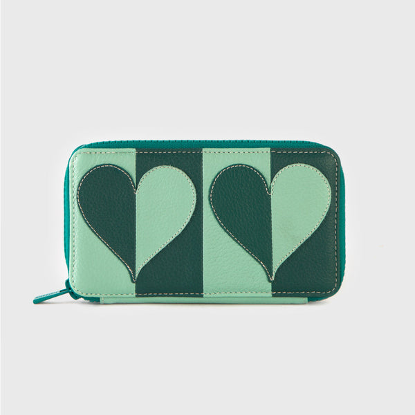 TE PRESENTAMOS EL MINI POUCH MANDY VERDE. UN ESPECTACULAR MINI POUCH DE COLOR VERDE CON UNA DECORACIÓN DE CORAZONES.