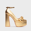Zapato plataforma en cuero dorado. De punta cerrada, presenta suela y taco alto forrado de 13 cm con plataforma de 4 cm, lo que brinda altura con estabilidad. Interior en cuero y suela de cuero. Impactante y glamuroso, ideal para looks de noche.
