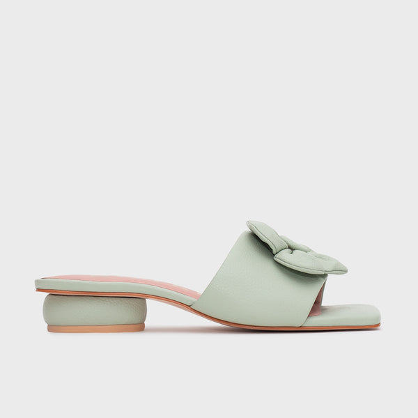 Zapato flat en cuero verde con diseño de punta abierta. En el frente luce una flor Gardenia en relieve, elaborada y cocida a mano, que aporta volumen y feminidad. Plantilla y forro de cuero para máximo confort, suela plana en cuero que asegura ligereza. Altura 2 cm, ideal para usar todos los días con estilo y frescura.