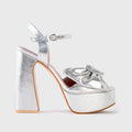 Te presentamos nuestra plataforma favorita, Antonia. Es de cuero metalizado color plata. Esta plataforma mide 5 cm y tiene un taco de 13 cm perfectos para bailar toda la noche. En la parte del tobillo podrás ajustarlo a tu gusto. En la parte delantera encontrarás un lazo que ayudará a estilizar tu outfit.