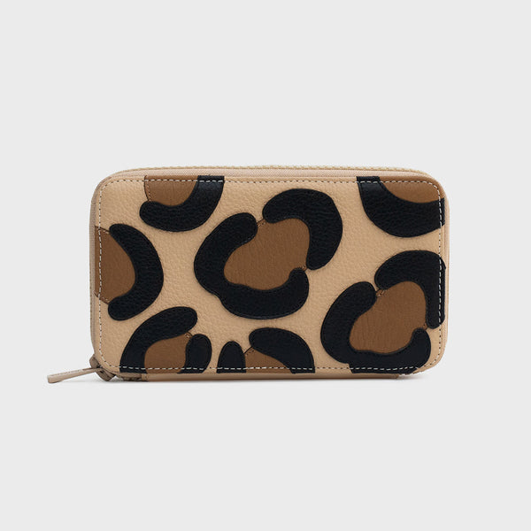 Te presentamos el Mini Pouch Kat Crema. Un espectacular mini pouch de color crema con una decoración de animal print.
