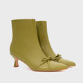 Botín de cuero en color verde cactus con diseño estilizado y moderno. El lazo frontal añade un detalle distintivo que realza su estética femenina. Su taco de 5 cm brinda la altura ideal para un look elegante sin perder comodidad. Un modelo con personalidad que aporta un toque de color a cualquier outfit.