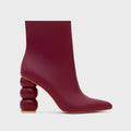 Botín de cuero en tono mora con un diseño sofisticado y femenino. Presenta un taco escultural de 9 cm, formado por piezas redondeadas que le dan un carácter único. La mezcla de texturas de cuero resalta la riqueza del diseño y aporta un acabado especial. Un modelo elegante y moderno que eleva cualquier outfit.