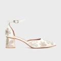 Freda Midi Bride features hand-stitched white leather flowers. The ankle strap allows for adjustable fit. This midi has a 5cm heel, the perfect height for dancing the night away.