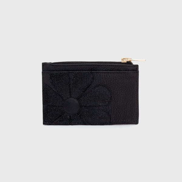 We present our new card holder with detailed hand-woven black flower appliqués on black leather. The Janis card holder has six spaces to put your cards and a space with a zipper for coins.