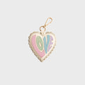 Heart-shaped charm in off-white leather with the word "LOVE" engraved on it. It features gold-tone metal hardware for secure attachment. Timeless and delicate, a versatile piece.