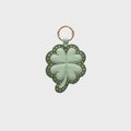 Green leather charm with a circular shape, adorned with an embroidered clover on the front. It features a metal hook for easy attachment to any accessory. A simple detail, yet loaded with symbolism of luck and prosperity.