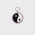 Small circular charm in black leather. The front is embroidered with a contrasting Yin Yang symbol. It features a metal hook for easy attachment to wallets, belts, or keychains. Minimalist and protective, it's ideal for personalizing accessories.