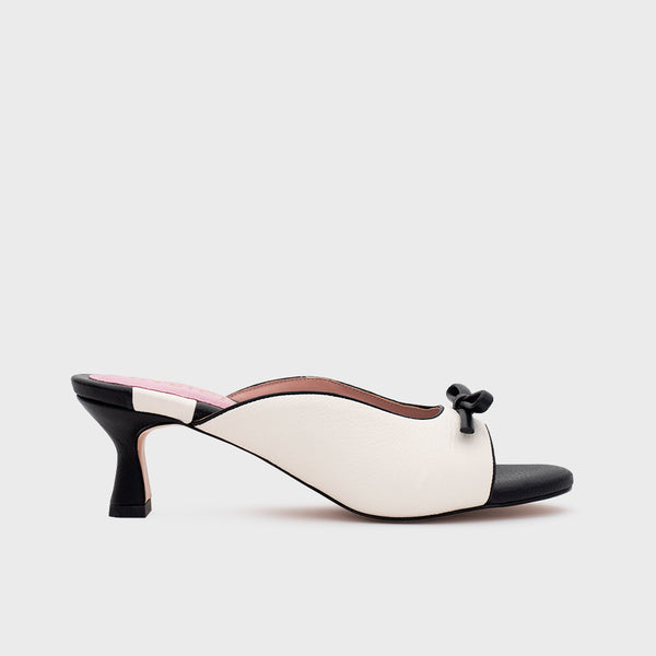 Mule en cuero color hueso con diseño de punta abierta y acabado minimalista. Lleva un lazo en cuero tono a tono en el empeine, dándole un detalle suave y femenino. Plantilla y forro en cuero, suela en cuero firme y taco de 5 cm forrado. Sofisticado, versátil y perfecto para elevar cualquier outfit de verano.