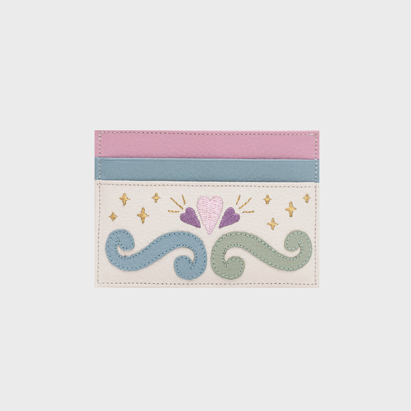Flat card holder in off-white leather with a rectangular silhouette. The front features a unique hand-embroidered design that conveys a romantic and delicate feel. It features open card slots on both sides and a fabric interior. A lightweight and charming accessory to complement any wallet.