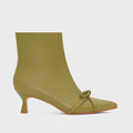 Botín de cuero en color verde cactus con diseño estilizado y moderno. El lazo frontal añade un detalle distintivo que realza su estética femenina. Su taco de 5 cm brinda la altura ideal para un look elegante sin perder comodidad. Un modelo con personalidad que aporta un toque de color a cualquier outfit.