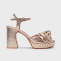 Pump en cuero dorado platino con acabado luminoso. El frente lleva un lazo en cuero dorado, trabajado artesanalmente para resaltar su diseño. Forro y plantilla en cuero, suela en cuero firme y taco de 9 cm. Sofisticado y radiante, perfecto para ocasiones especiales.