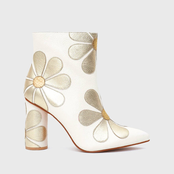 The Janis boot in off-white leather with hand-woven gold flowers is the perfect touch of glamour and elegant style.
