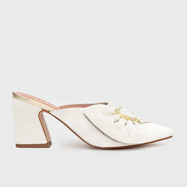 Blair Mule Pump Bride features a bow on the front of the shoe adorned with a heart charm, the charm is decorated with pearls. This mule pump is made of velvet material. The heel is 9cm perfect for spending the night dancing without losing glamour.