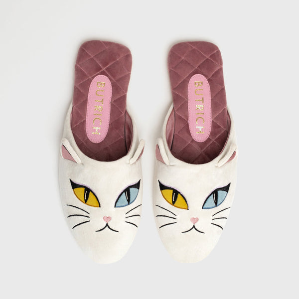 Discover our comfortable Kitty Cat slippers in off-white with details in shades of light blue, green and black. Perfect and beautiful slippers with a cat touch. The insole is pink, extra padded and has a rubber sole.