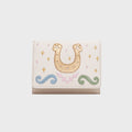 Billetera mediana en cuero hueso con la herradura de la suerte bordada. Forma rectangular, estructura firme y cierre imantado. Interior con ranuras para tarjetas y espacio para billetes y monedas. Clásica y simbólica.