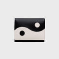 Medium wallet in two-tone black bone leather with the Yin Yang symbol on the front. Rectangular shape, sturdy structure, and magnetic closure for security. Interior with space for bills, card slots, and a coin pocket. A design that balances minimalism and character.